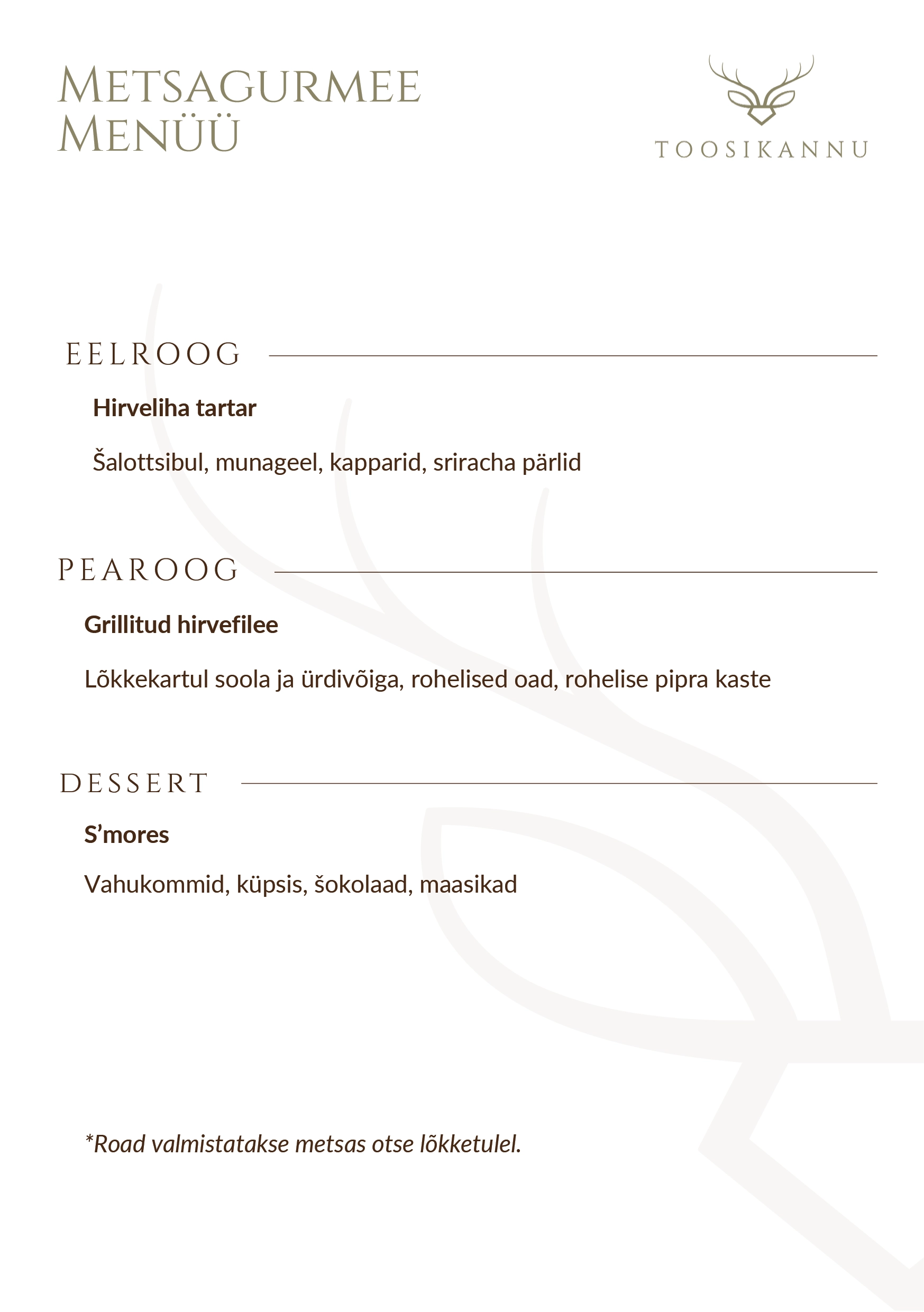 Menüü algab hõrgu hirveliha tartariga, millele järgneb mahlane grillitud hirvefilee. Lõpetuseks suussulav magustoit – S’mores, mille valmistamisel saate ise käed külge panna.