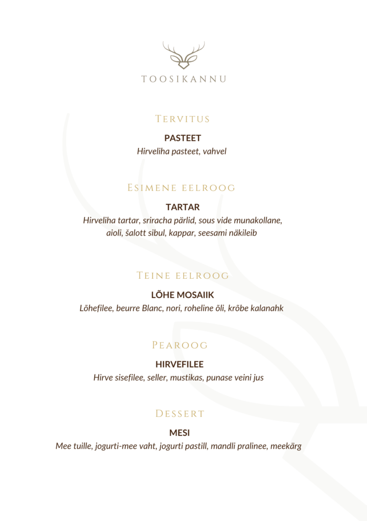 Viiekäiguline menüü algab õrnalt, metsikust loodusest inspireeritud tervitusroaga, mis seob kokku hooajalise tooraine ja maitserikkuse. Seejärel liigume edasi eelroogade juurde — värsked kooslused ja peen serveering annavad aimu õhtu iseloomust: köögist, mis on samaaegselt puhas, läbimõeldud ja loov. Õhtu südameks on meisterlik pearoog, mille täiuslik küpsus ja tasakaalus maitsed loovad rikkaliku kõrghetke kogu elamusele. Magustoiduks saadab hõrk lõpetus — õrn ja üllatav — sulab suus ning lisab õhtule väärika lõpu.